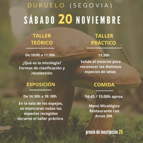 El próximo 20 de noviembre se va a desarrollar en la localidad de Duruelo (Segovia) una jornada micológica que consistirá en un taller teórico, salida a campo, exposición micológica y comida con menú micológico.